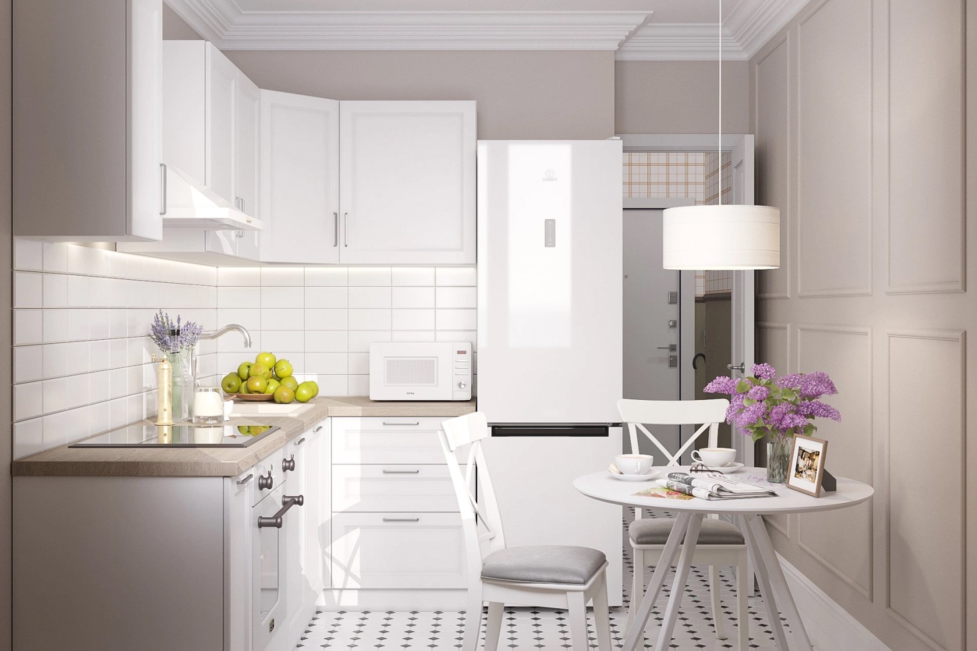 Даже для малогабаритной кухни белый цвет — отличное решение. Использование компактной техники, такой как мини-плита и мини-раковина, в сочетании со светлыми фасадами помогает избежать ощущения тесноты и создать уютное функциональное пространство.