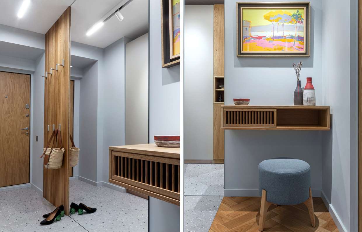 На практике для маленькой прихожей часто достаточно базовых элементов: вешалки для верхней одежды, зеркала и нескольких полок для обуви и аксессуаров. Остальные вещи можно разместить в гардеробной или шкафах в других комнатах, чтобы не перегружать входную зону.