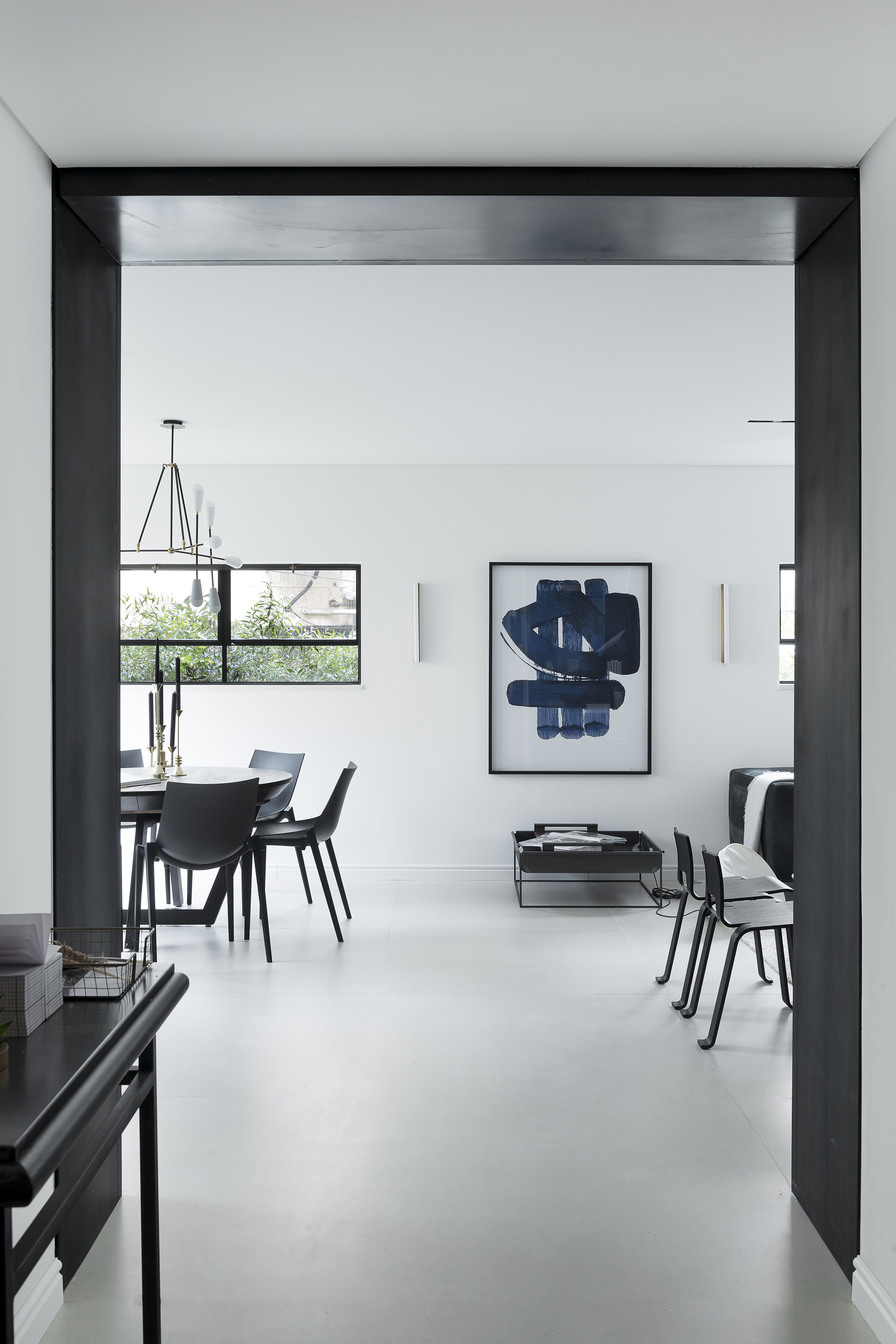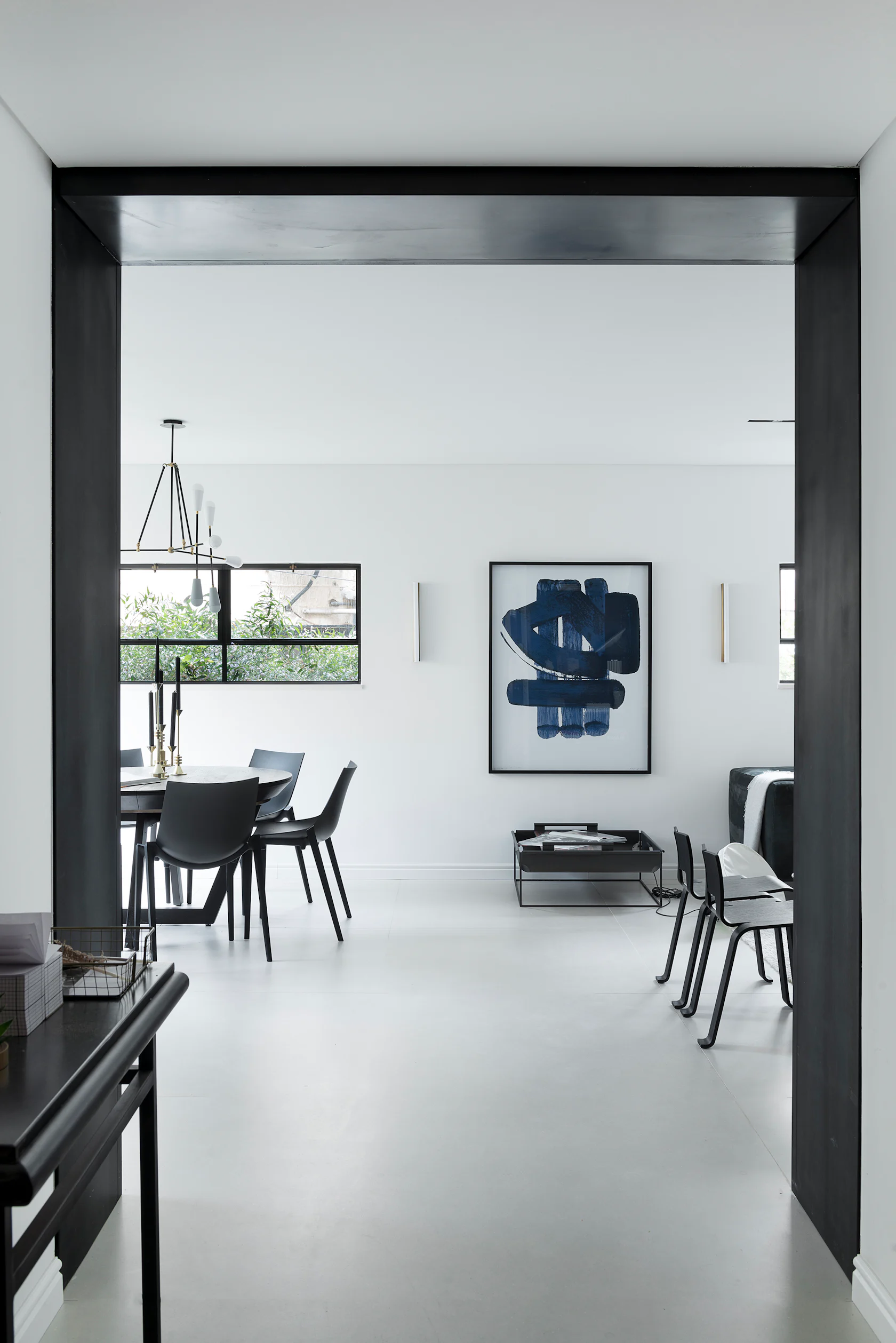 Три спальни с индивидуальными ванными комнатами были организованы в L-образную конфигурацию вокруг нового общественного пространства. Такая планировка не только обеспечила приватность личных зон, но и позволила максимально использовать естественное освещение и открыть вид на оживленную улицу. Общественная зона буквально наполнилась светом и воздухом, что резко контрастирует с первоначальным состоянием квартиры.