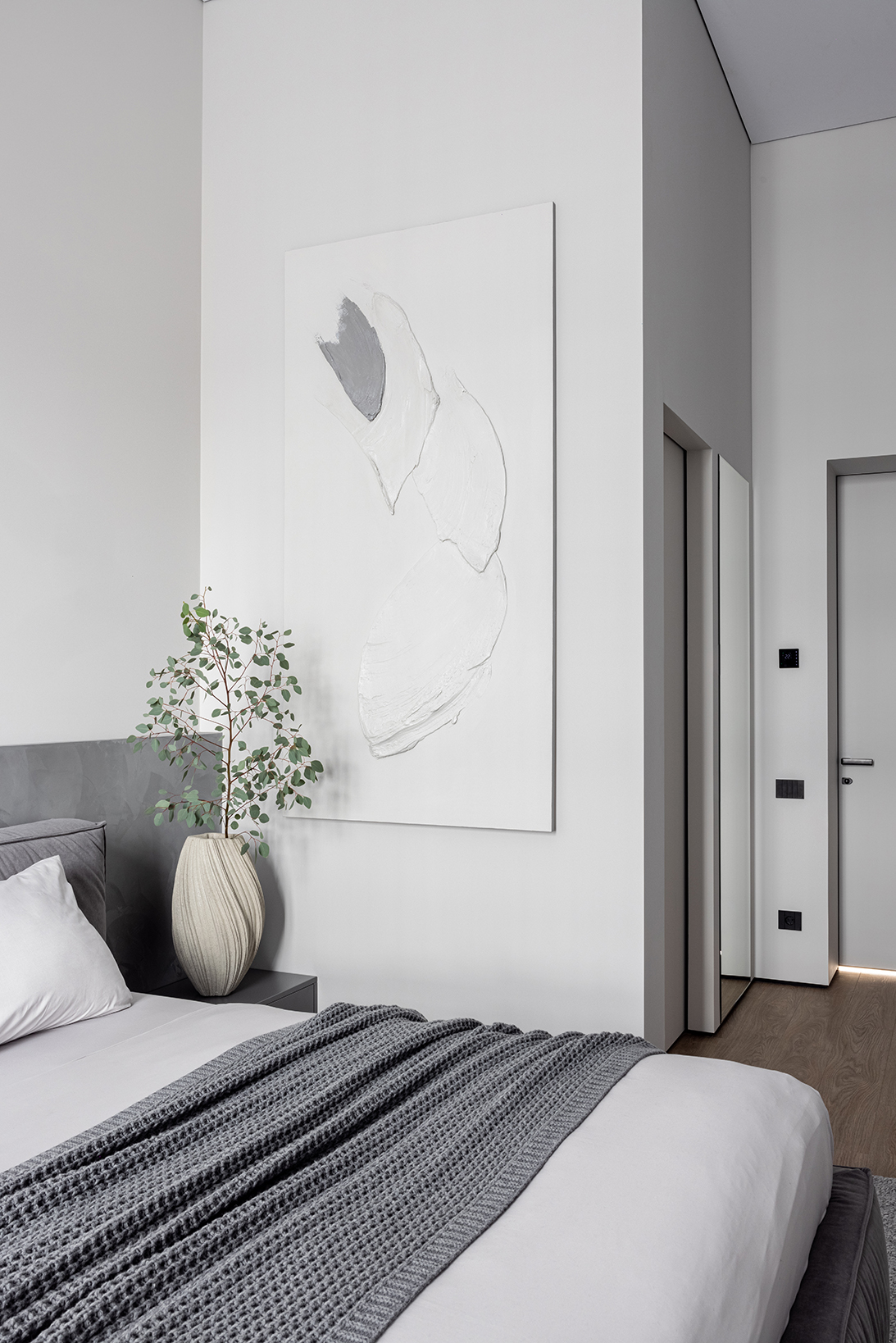 Чтобы оживить монохромную палитру, дизайнеры добавили несколько ярких пятен. Например, изумрудно-зеленый диван стал выразительным акцентом в гостиной. Большие окна, характерные для многих современных проектов, наполняют квартиру естественным светом, усиливая ощущение простора и свободы. В целом, интерьер получился одновременно стильным, практичным и очень уютным — идеальным домом для активной городской семьи.