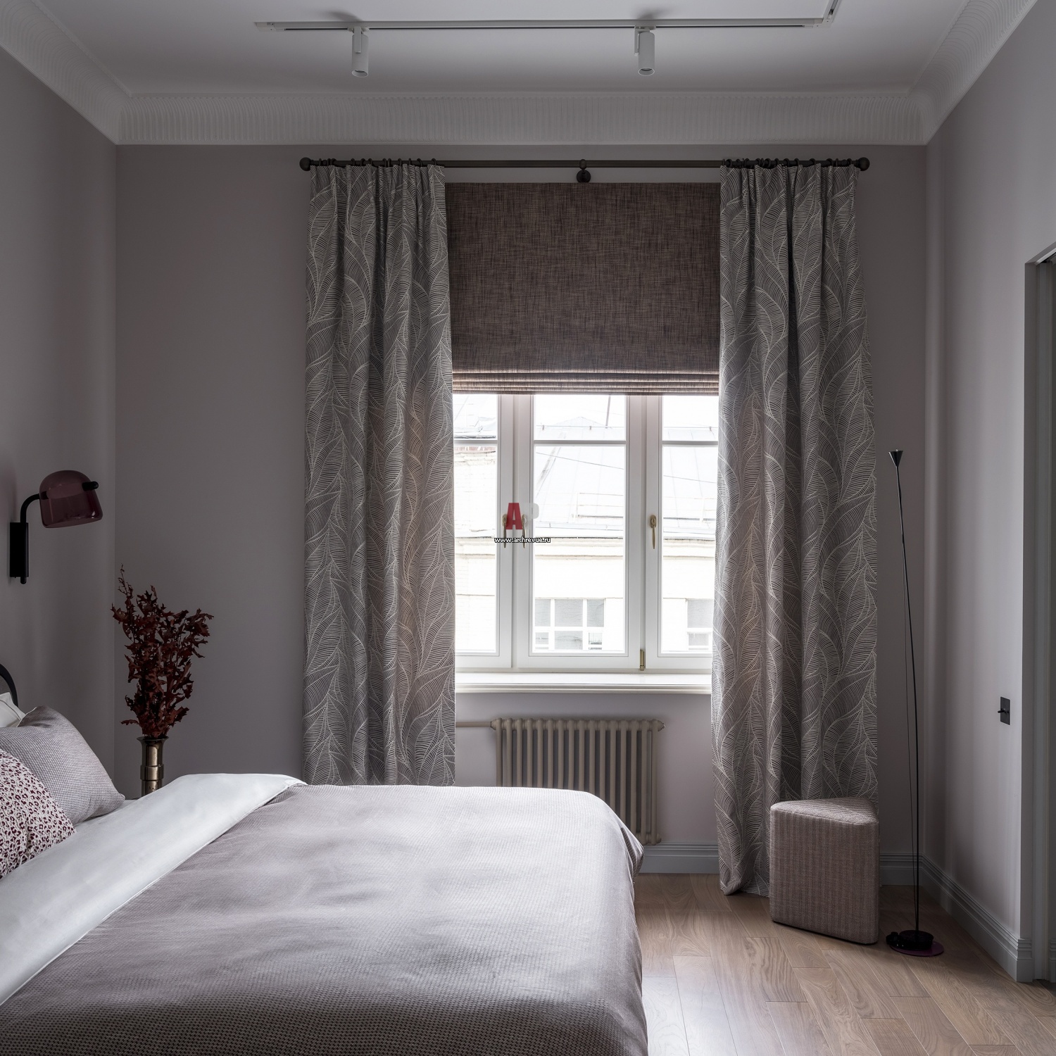 Ключевой идеей проекта стал бережный подход к наследию здания. Высокие потолки и восстановленные лепные молдинги создают благородный фон, напоминая об истории места. На этом фоне современная мебель, строгие линии и многослойность серых оттенков выглядят особенно выразительно, формируя интерьер, который уважает прошлое, но живет в настоящем.