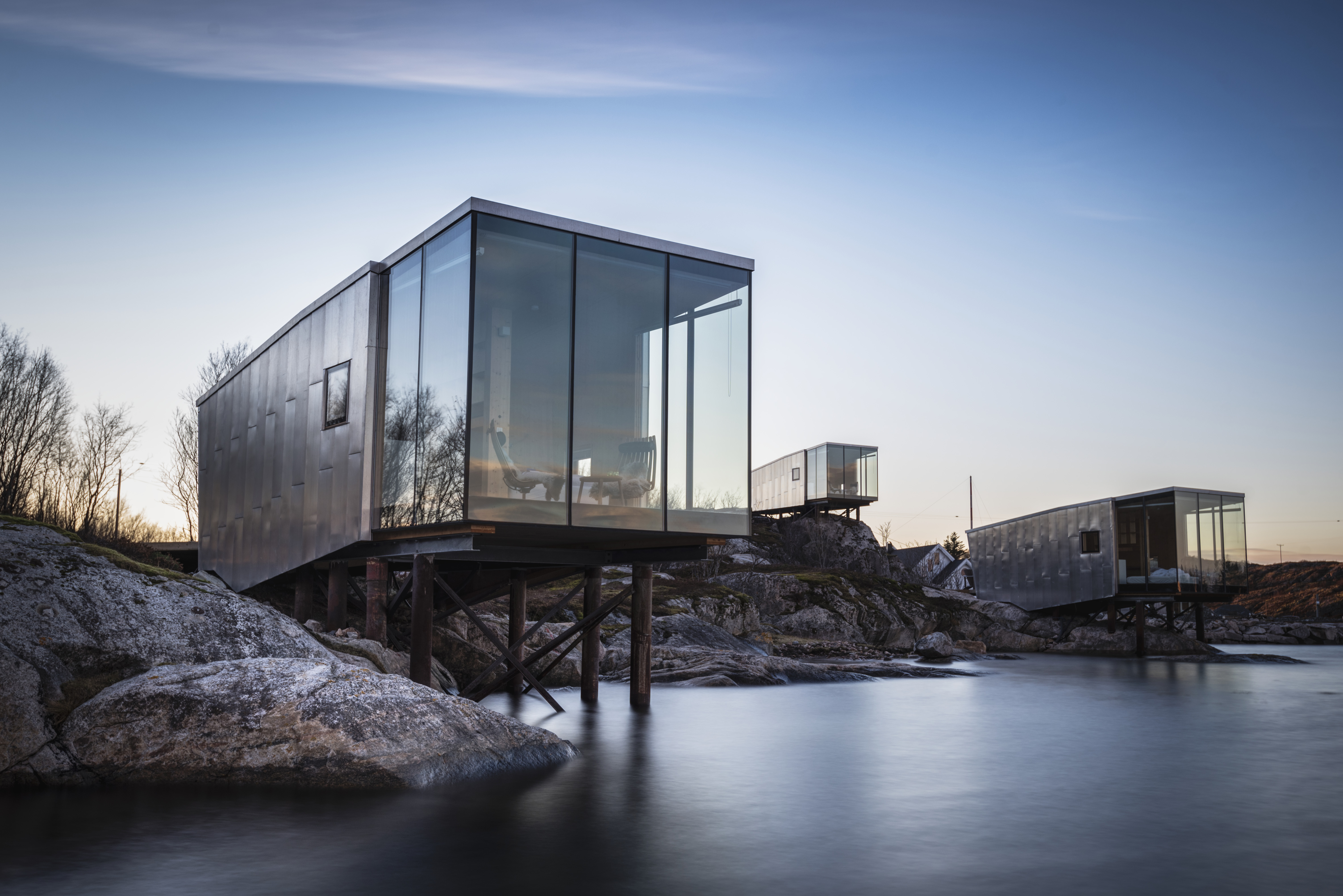 Архитекторы бюро Stinessen Arkitektur предложили решение в виде двух отдельных объёмов. Такая композиция не только функциональна, но и позволяет максимально раскрыть виды. В одном блоке разместилась просторная гостиная с панорамным остеклением и камином, создающая ощущение единения с ландшафтом. Второй объём отведён под приватную зону: здесь находятся спальни, сауна и просторная терраса. Благодаря продуманной, нестандартной планировке, из разных точек дома гости и хозяева могут любоваться постоянно меняющимися, но неизменно роскошными видами на фьорд и горы.