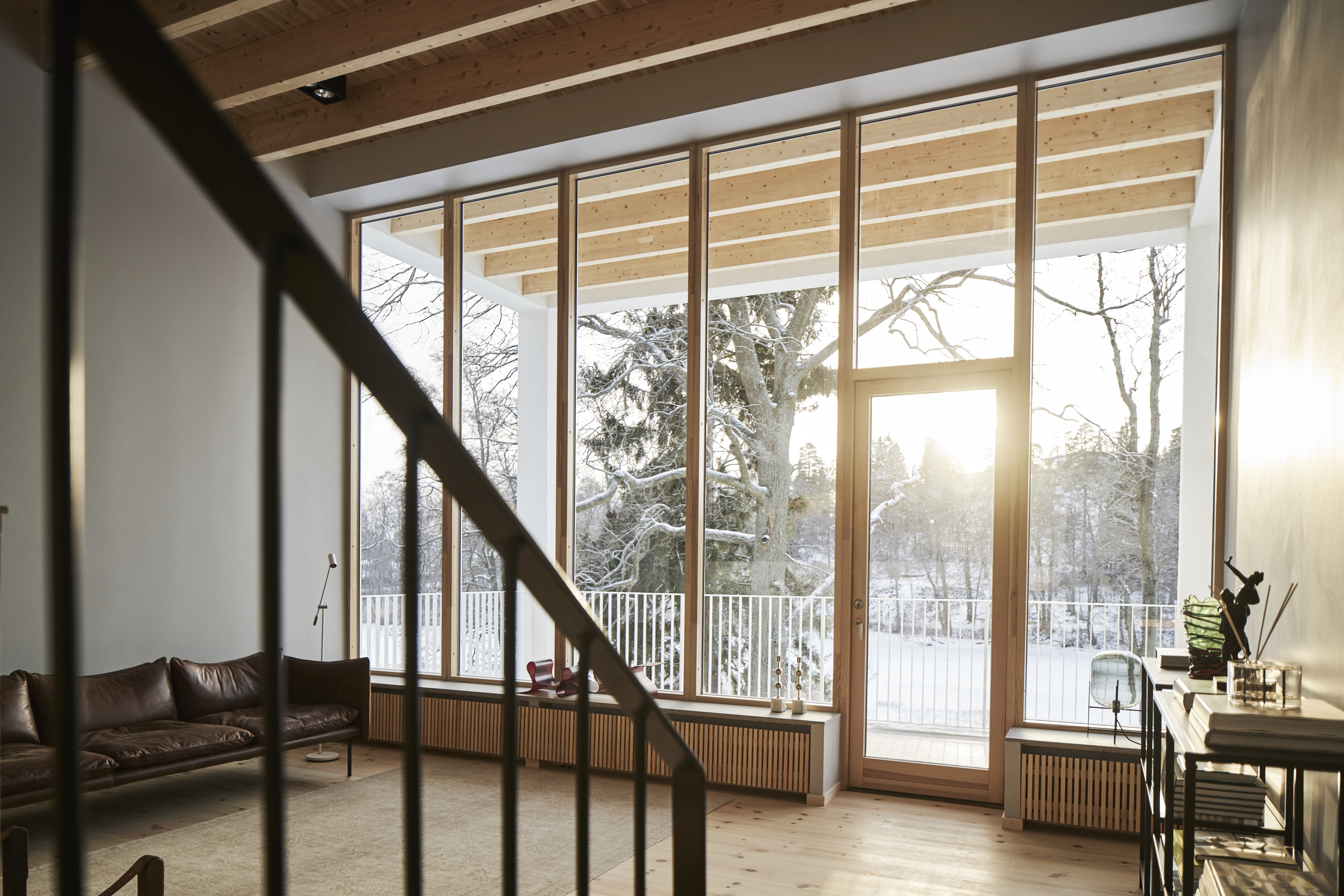 Особого восхищения заслуживают окна, которые являются центральным элементом интерьера. Они не просто большие, а частично заворачиваются на потолок, образуя световые «арки». Такая конструкция максимально увеличивает инсоляцию, наполняя всё открытое пространство квартиры мягким естественным светом на протяжении всего дня. Это ключевой приём, который визуально расширяет границы помещения и создаёт ощущение воздушности и свободы.